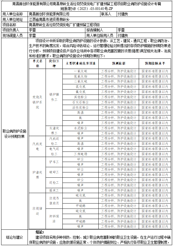 南昌首创环保能源有限公司南昌泉岭生活垃圾焚烧发电厂扩建预留工程项目职业病防护设施设计专篇