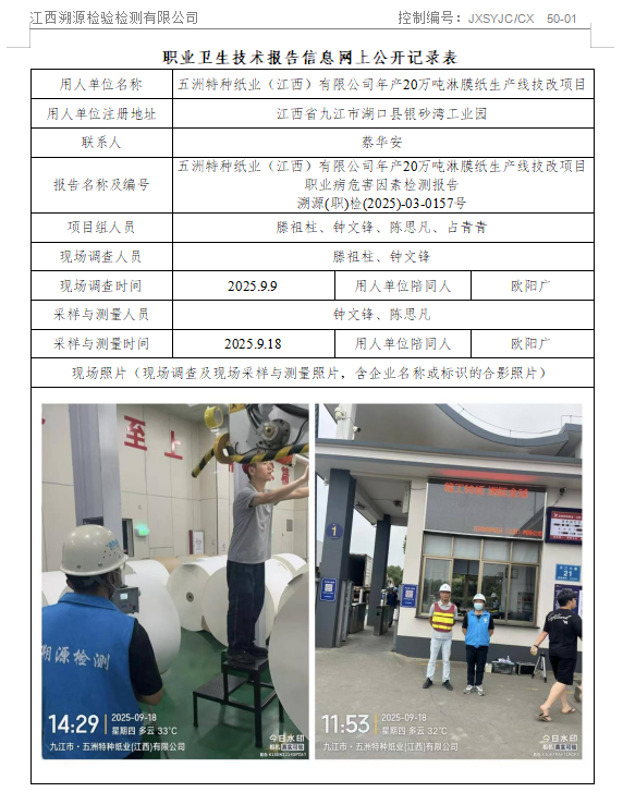 五洲特种纸业(江西)有限公司年产20万吨淋膜纸生产线技改项目职业病危害因素检测报告