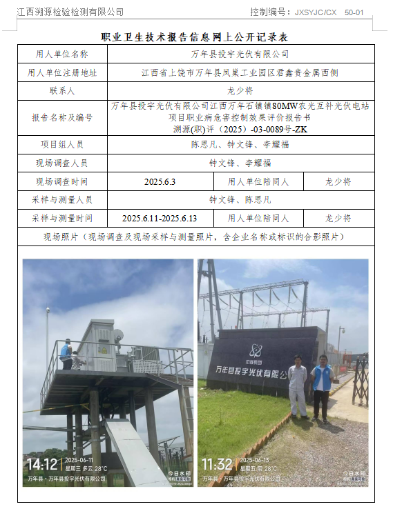 万年县投宇光伏有限公司江西万年石镇镇80MW农光互补光伏电站项目职业病危害控制效果评价报告书