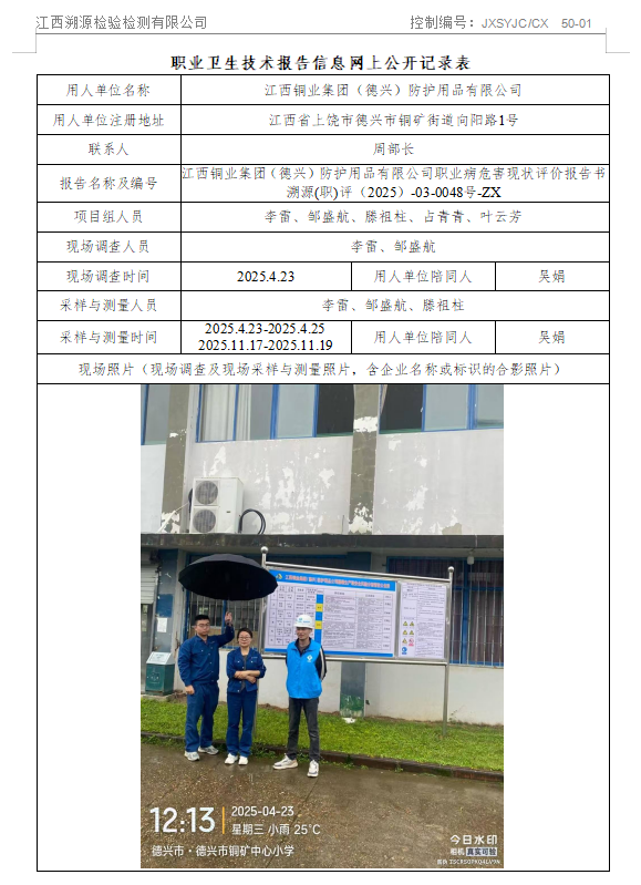 江西铜业集团(德兴)防护用品有限公司职业病危害现状评价报告书