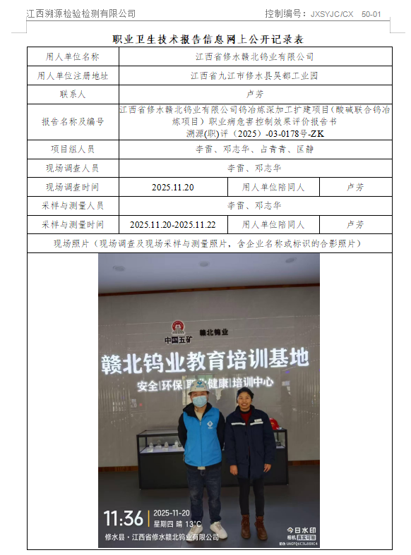 江西省修水赣北钨业有限公司钨冶炼深加工扩建项目(酸碱联合钨冶炼项目)职业病危害控制效果评价报告书