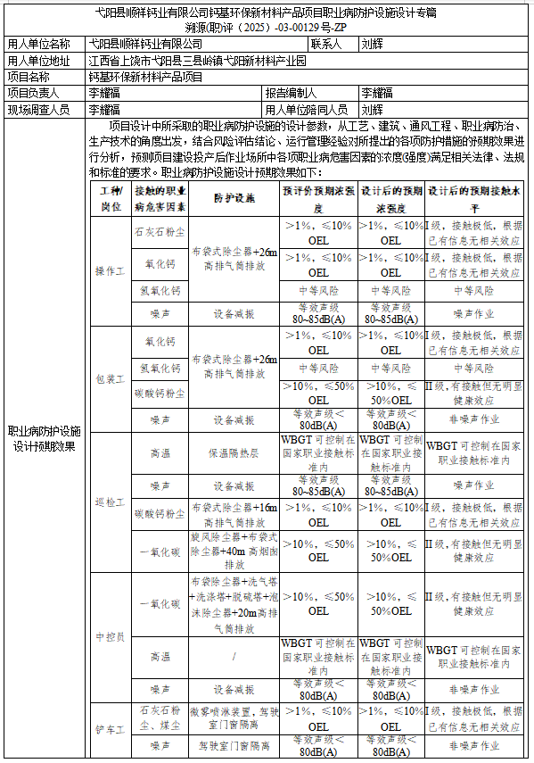 弋阳县顺祥钙业有限公司钙基环保新材料产品项目职业病防护设施设计专篇