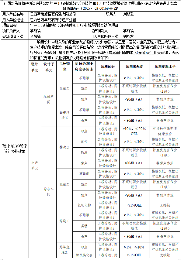江西新甬峰精密铸造有限公司年产1万吨精铸硅溶胶铸件和1万吨精铸覆膜砂铸件项目职业病防护设施设计专篇