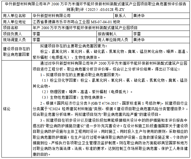 华升新型材料有限公司年产2000万平方米循环节能环保新材料装配式建筑产业园项目职业病危害预评价报告