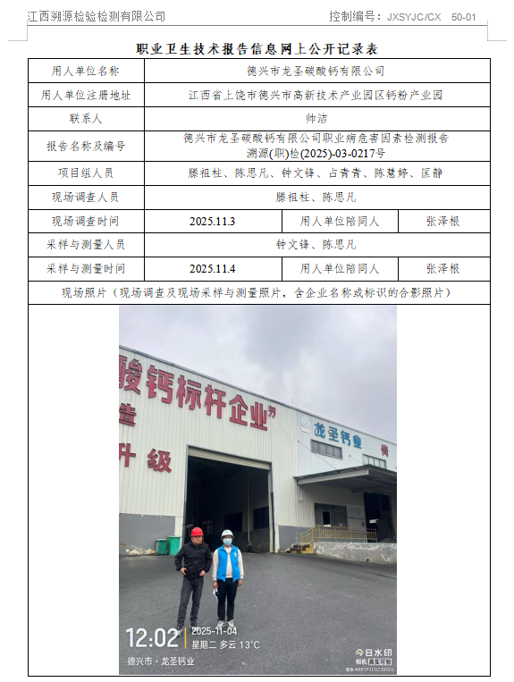 德兴市龙圣碳酸钙有限公司职业病危害因素检测报告