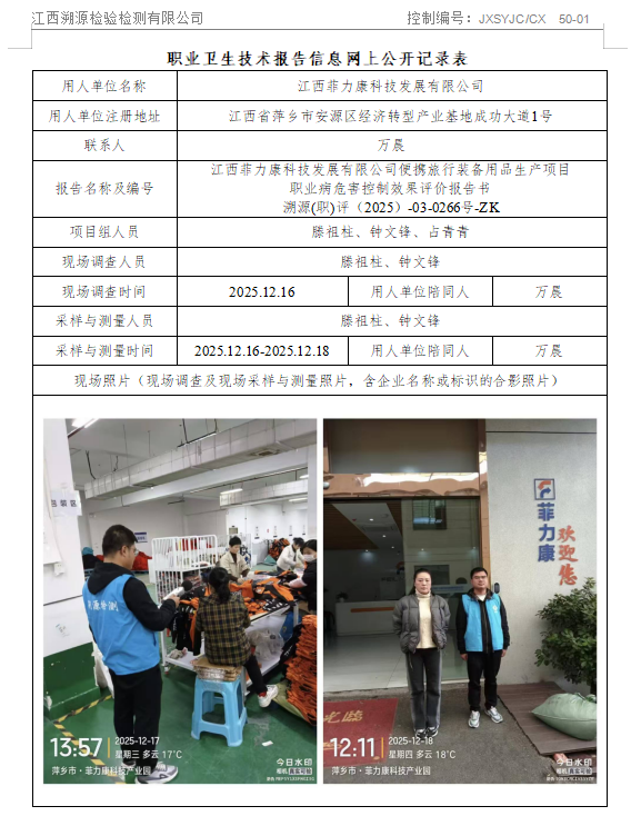 江西菲力康科技发展有限公司便携旅行装备用品生产项目职业病危害控制效果评价报告书
