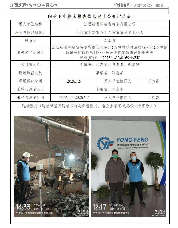 江西新甬峰精密铸造有限公司年产1万吨精铸硅溶胶铸件和1万吨精铸覆膜砂铸件项目职业病危害控制效果评价报告书