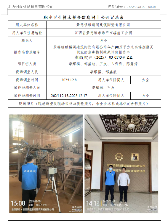 景德镇麒麟阁建筑陶瓷有限公司年产90万平方米高端别墅瓦职业病危害控制效果评价报告书