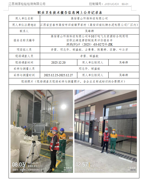 高安菁山环保科技有限公司年10万吨飞灰资源综合利用项目职业病危害控制效果评价报告书