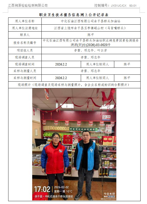 中化石油江西有限公司余干县桥头加油站职业病危害因素检测报告