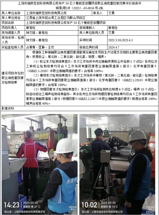 上饶市瑞辰密封科技有限公司年产30亿个橡胶密封圈项目职业病危害控制效果评价报告书