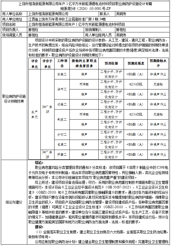 上饶市恒瀛新能源有限公司年产1亿平方米新能源锂电池材料项目职业病防护设施设计专篇