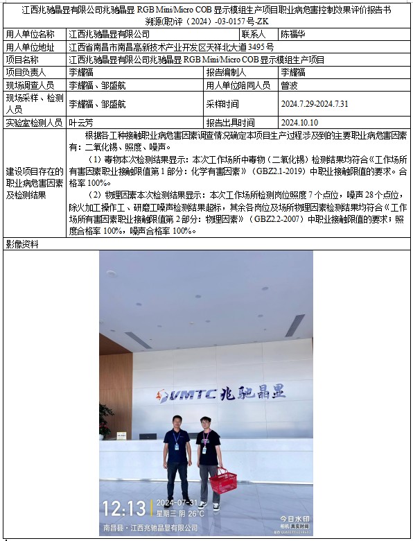 江西兆驰晶显有限公司兆驰晶显RGB Mini/Micro COB显示模组生产项目职业病危害控制效果评价报告书